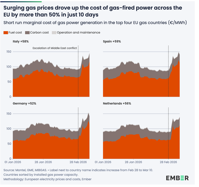 As a net energy importer, Europe is grappling with soaring prices—gas futures have doubled and oil prices have risen by more than 50% since the start of the year. According to global energy think tank Ember, wind and solar accounted for 30.1% of EU electricity generation in 2025—well short of the 60%-plus target for 2030. Meanwhile, energy security remains fragile: in the first ten days of the latest Middle East conflict, the cost of gas-fired power in Europe jumped by more than 50%. Shell's executive Wael Sawan warns energy shortage as early as next month.