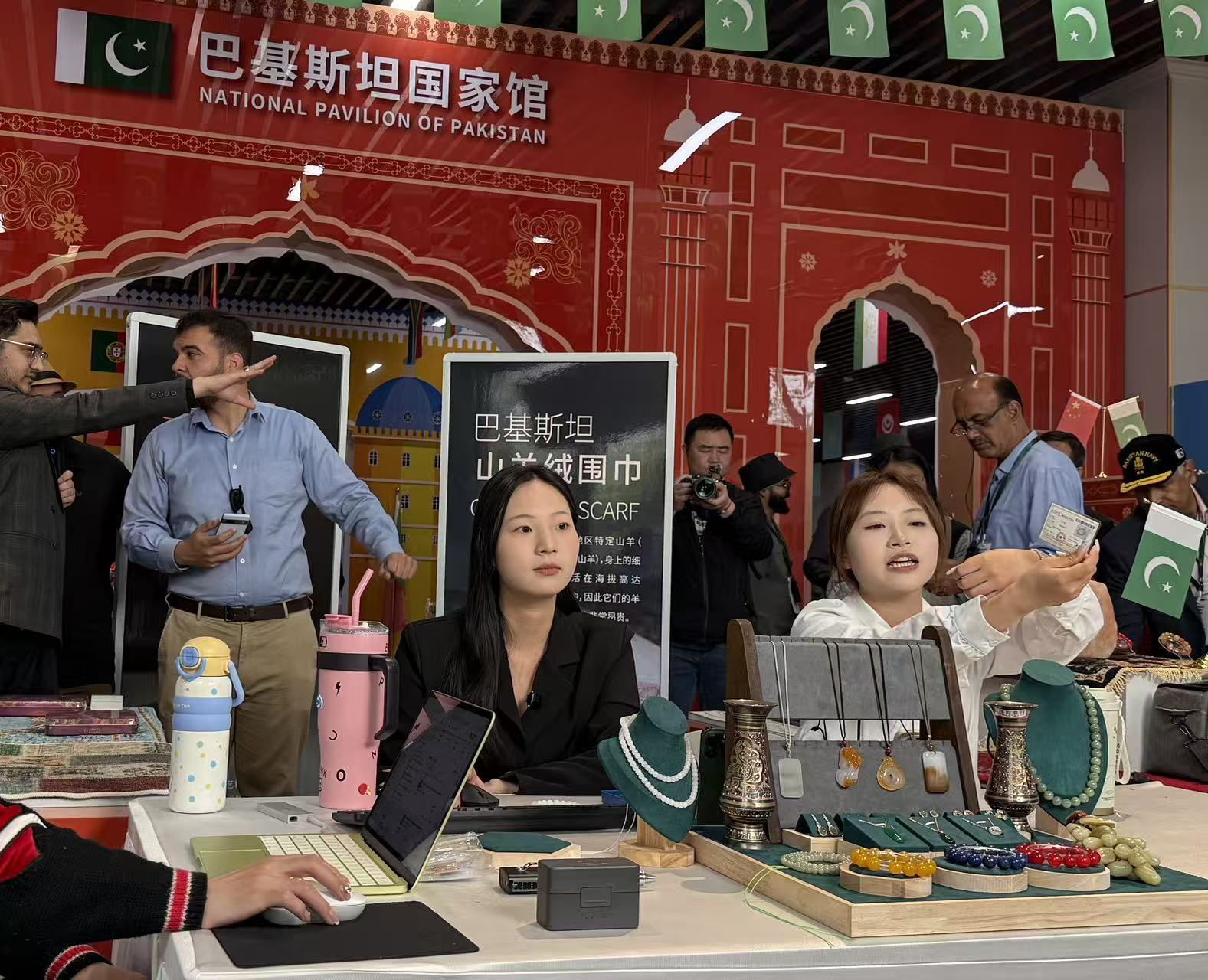 Chinese live-streamers boost Pakistani products at the National Pavilion of Pakistan [Photo by Zhao Xiaopeng]