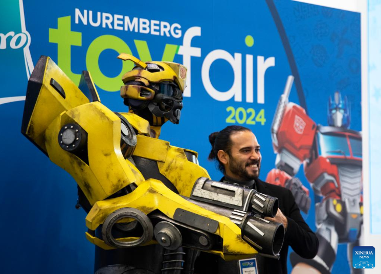 A visitor poses for photos with a Bumblebee figure at the Nuremberg International Toy Fair (Spielwarenmesse) in Nuremberg, Germany, Jan. 30, 2024. As a leading trade fair for toys, hobbies and leisure, the Spielwarenmesse kicked off here on Tuesday with over 2,100 participating companies from around the world. (Xinhua/Zhang Fan)