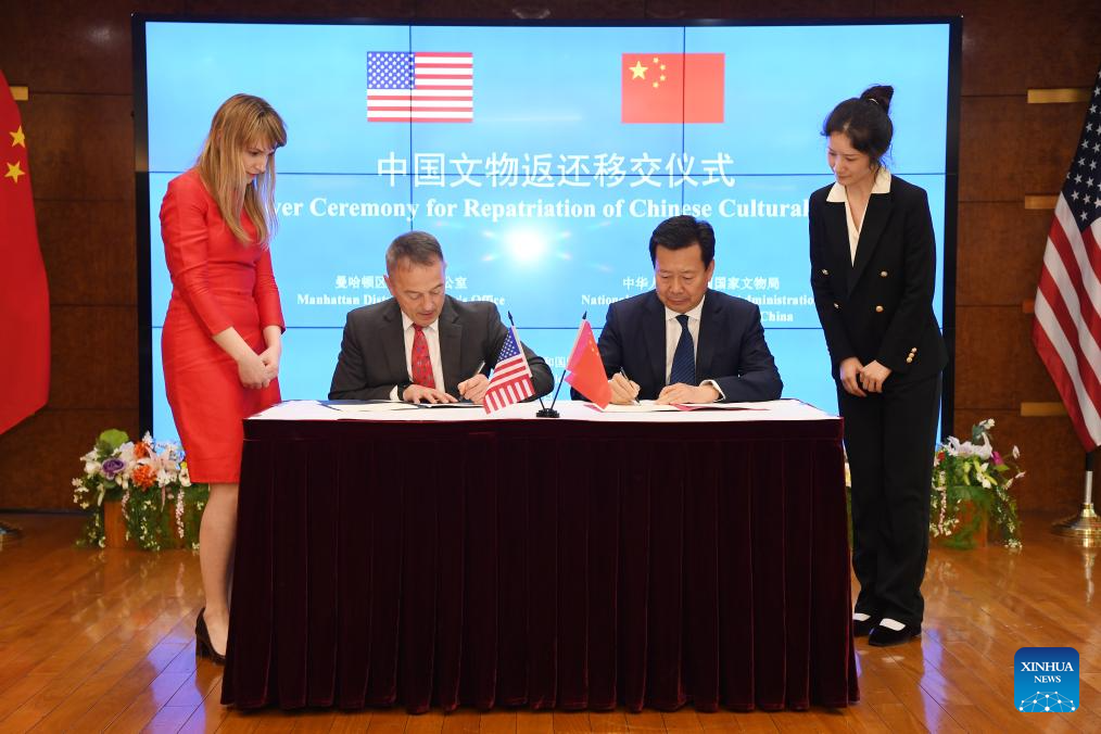 NEW YORK, April 17 (Xinhua) -- The U.S. side returned 38 pieces of Chinese cultural objects to the Chinese side on Wednesday.