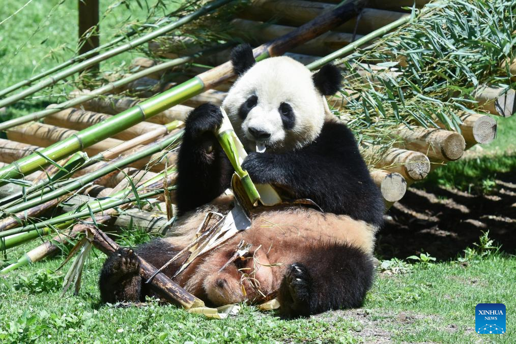 Photo taken on May 30, 2024 shows male panda Jin Xi at Madrid Zoo in Madrid, Spain. Visitors to Spain's Madrid Zoo Aquarium were introduced Thursday to a giant panda couple from China. The new arrivals were welcomed at an official ceremony attended by authorities and experts from both countries. (Photo by Gustavo Valiente/Xinhua)