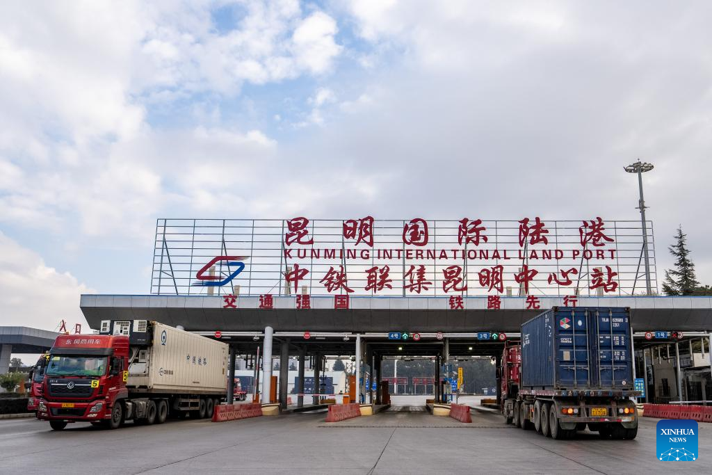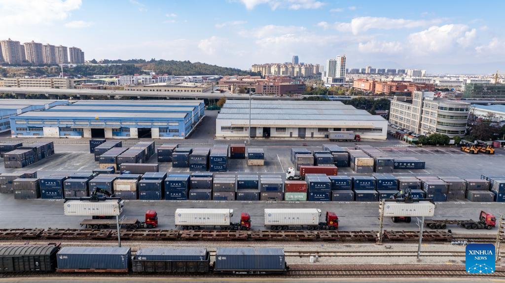 An international cargo train of China-Laos Railway is pictured at Wangjiaying West Station in Kunming, southwest China's Yunnan Province, on Jan. 2, 2025. Since the full operation of the China-Laos Railway on Dec. 3, 2021, the total cargo throughput of the railway has exceeded 50 million tons, including 11.58 million tons of cross-border goods. (Xinhua/Hu Chao)