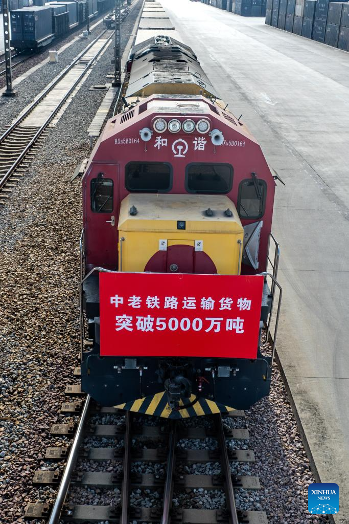 An international cargo train of China-Laos Railway loaded with fresh fruits and vegetables departs from Wangjiaying West Station in Kunming, southwest China's Yunnan Province, bound for Laos, on Jan 2, 2025. Since the full operation of the China-Laos Railway on Dec. 3, 2021, the total cargo throughput of the railway has exceeded 50 million tons, including 11.58 million tons of cross-border goods. (Xinhua/Hu Chao)