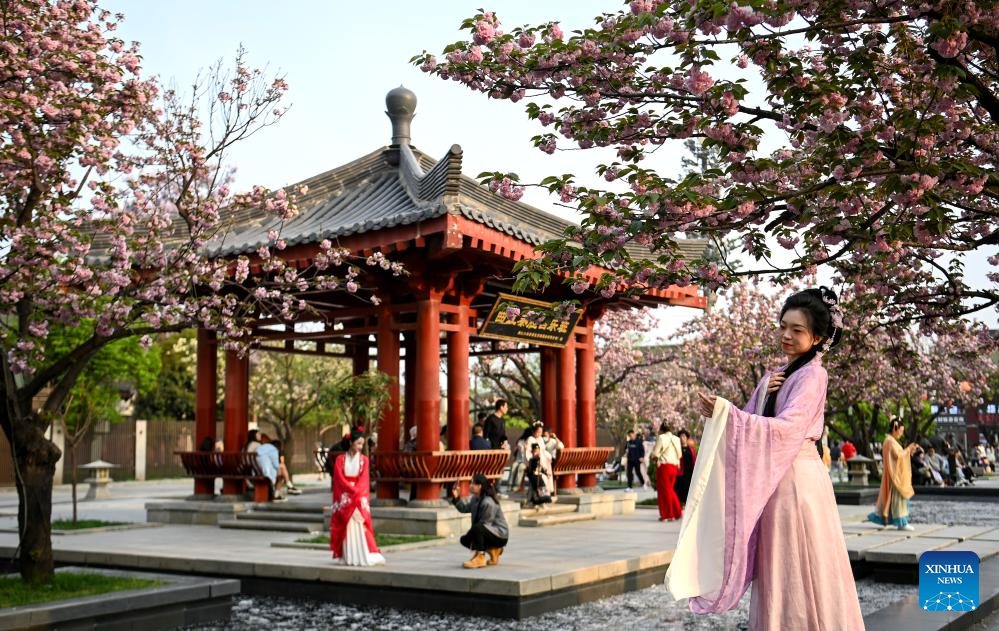 Tourists admire blossoms and pose for photos in the Giant Wild Goose Pagoda scenic area in Xi'an, northwest China's Shaanxi Province, April 8, 2024. As the provincial capital of northwest China's Shaanxi Province, Xi'an, with a history of over 3,100 years, has served as the capital city for 13 dynasties of China. Under the policies of protection and utilization of cultural relics, the historical and cultural resources of Xi'an have been well preserved. (Xinhua/Zou Jingyi)