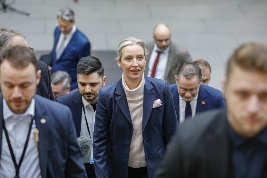 Alice Weidel (C), co-leader of the Alternative for Germany (AfD), arrives for a press conference in Berlin, Germany, Feb. 24, 2025. (Xinhua/Zhang Fan)
