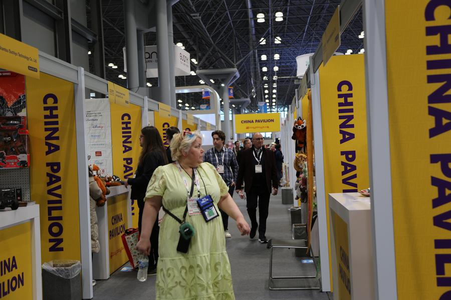 Visitors tour the China Pavilion at the 2025 North America International Toy Fair in New York, the United States, on March 2, 2025 (Xinhua/Liu Yanan)