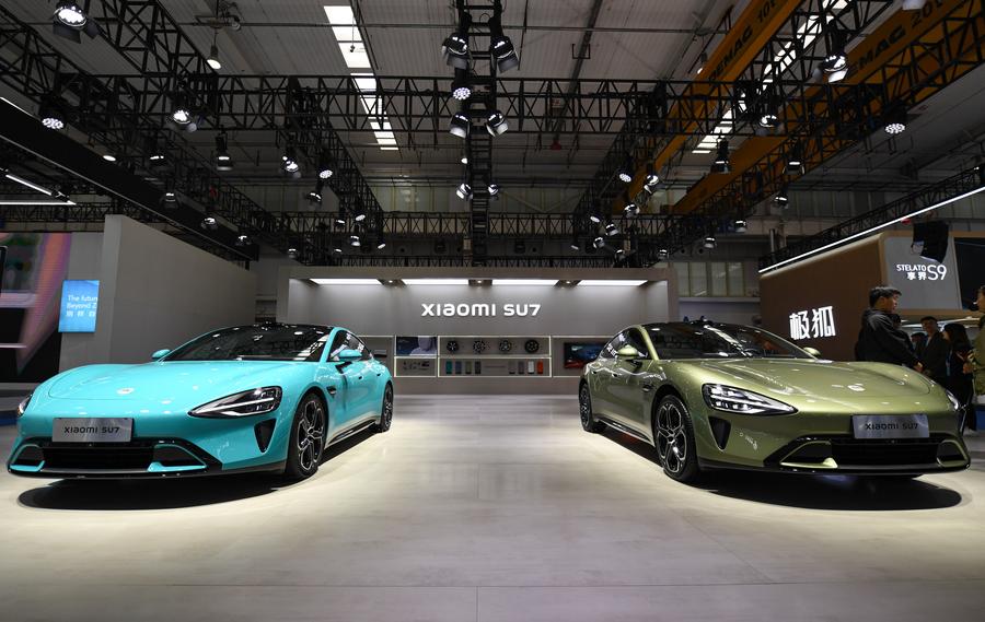 This photo taken on Oct. 17, 2024 shows new energy vehicle model SU7 produced by Chinese tech firm Xiaomi displayed during the 2024 World Intelligent Connected Vehicles Conference in Beijing, capital of China. (Xinhua/Chen Zhonghao)