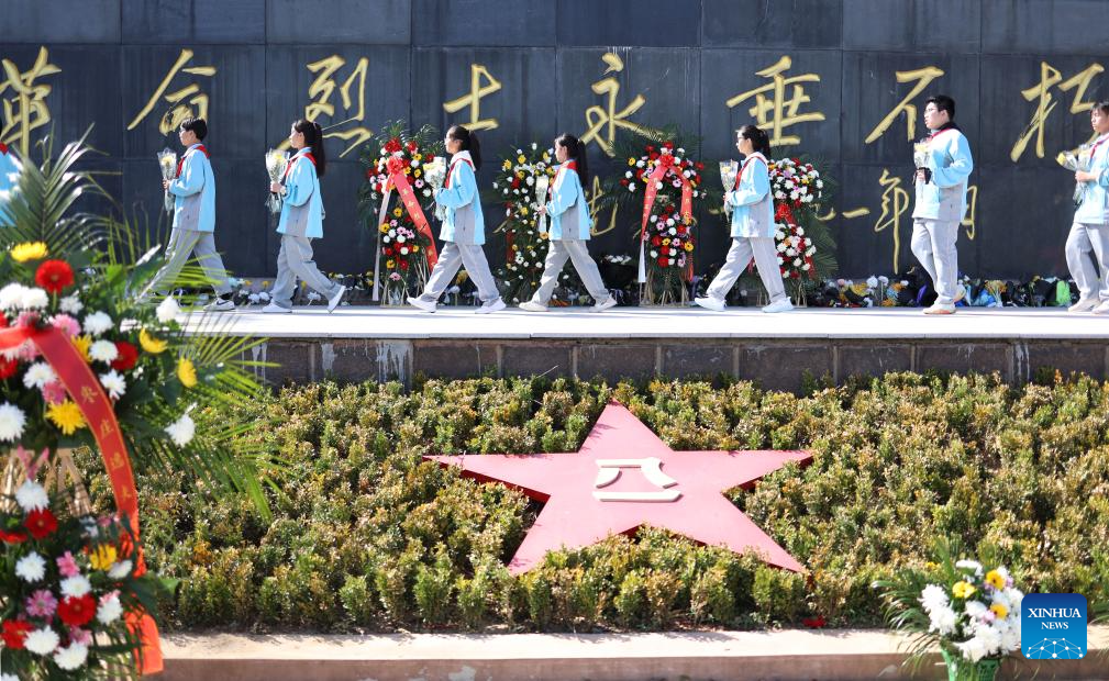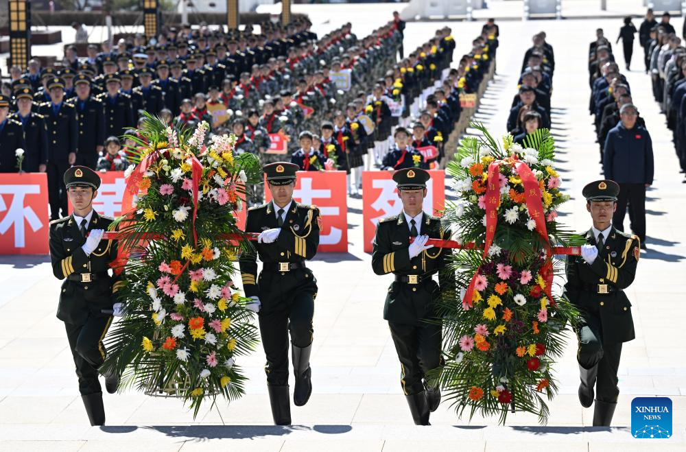 People pay tribute to martyrs in Hengyang, central China's Hunan Province, April 2, 2025. People across the country attend tomb-sweeping activities to pay tribute to martyrs ahead of the Qingming Festival, which falls on April 4 this year. (Photo by Cao Zhengping/Xinhua)