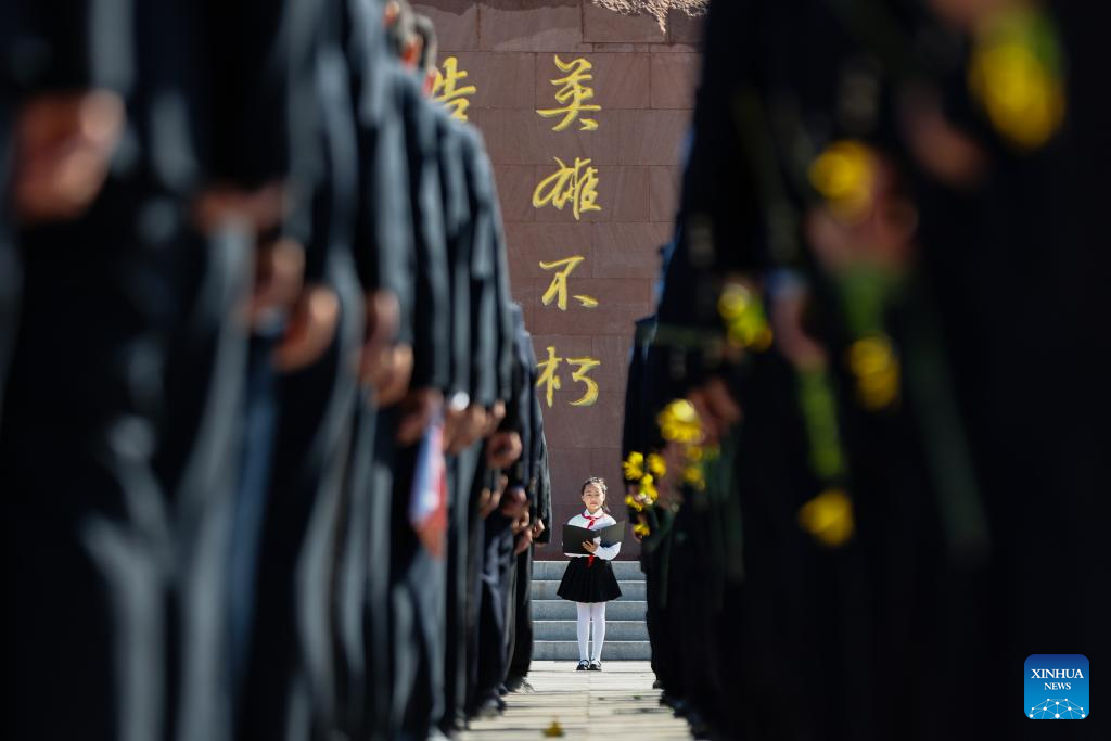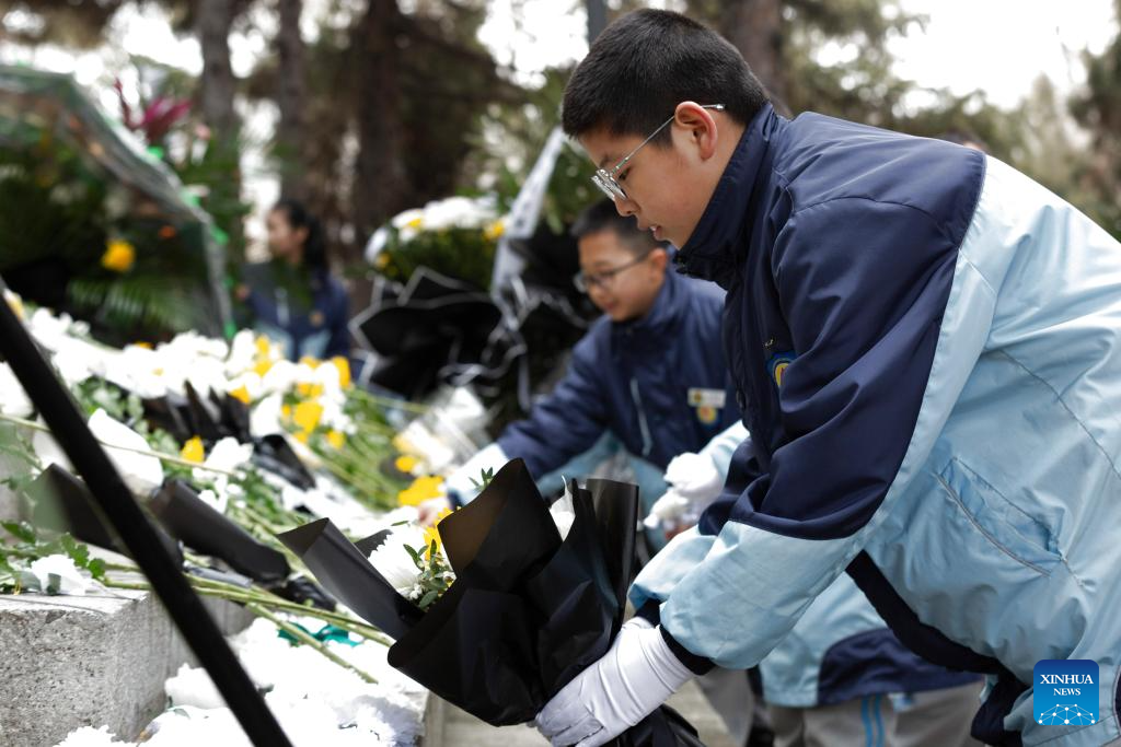 Students pay tribute to martyrs in Jiamusi City, northeast China's Heilongjiang Province, April 2, 2025. People across the country attend tomb-sweeping activities to pay tribute to martyrs ahead of the Qingming Festival, which falls on April 4 this year. (Photo by Chen Zhiguo/Xinhua)
