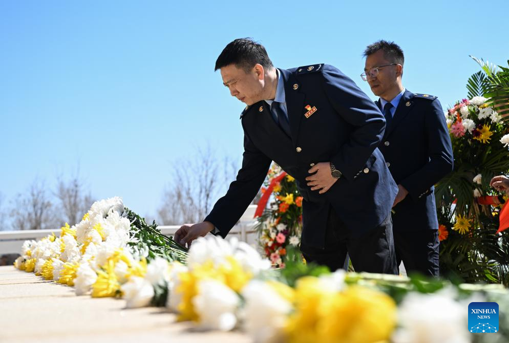 People pay tribute to martyrs at a martyrs' cemetery in Binhai New Area in north China's Tianjin, April 2, 2025. People across the country attend tomb-sweeping activities to pay tribute to martyrs ahead of the Qingming Festival, which falls on April 4 this year. (Photo by Du Penghui/Xinhua)