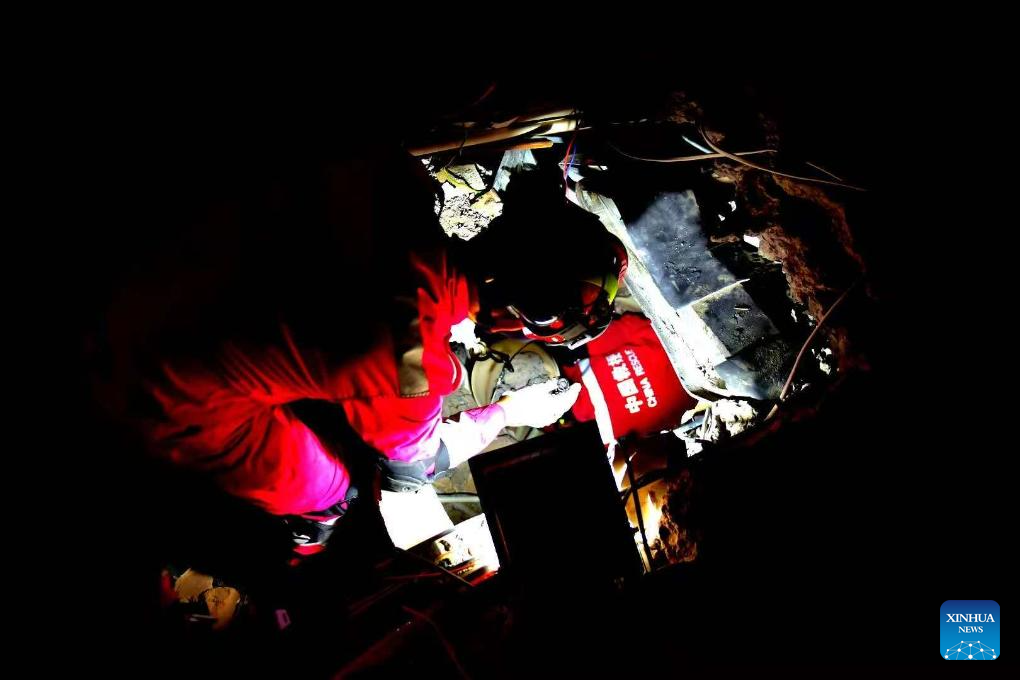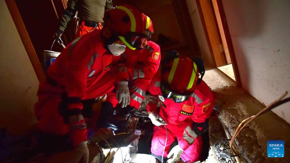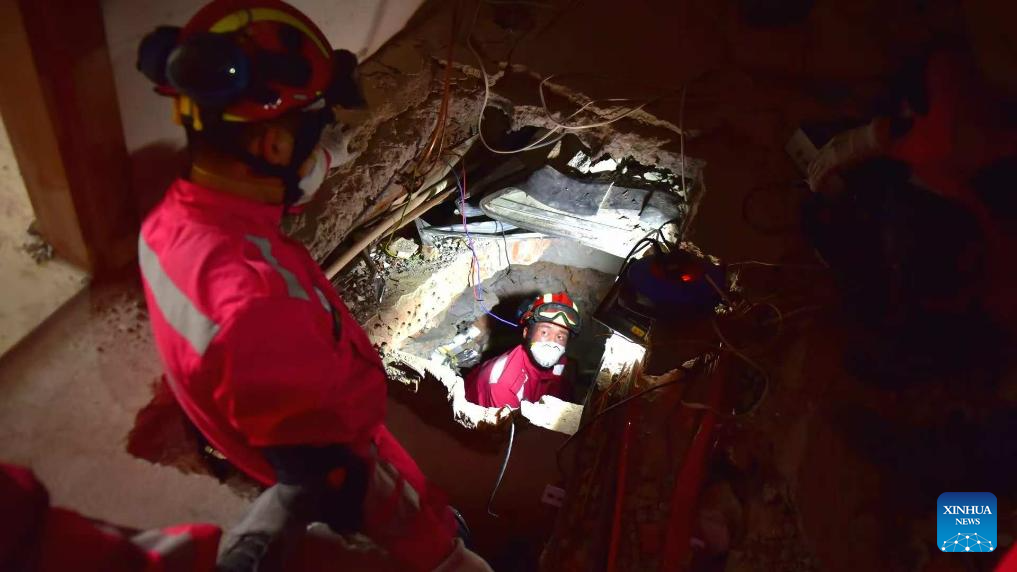 On Tuesday, eight operational groups conducted comprehensive inspections and reconnaissance at five key locations, covering a total of 30 buildings, with disinfection of an area of around 2,000 square meters. (China international search and rescue team/Handout via Xinhua)
