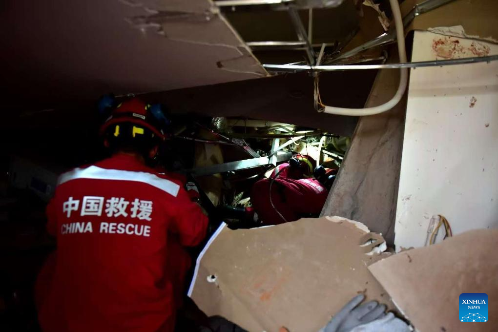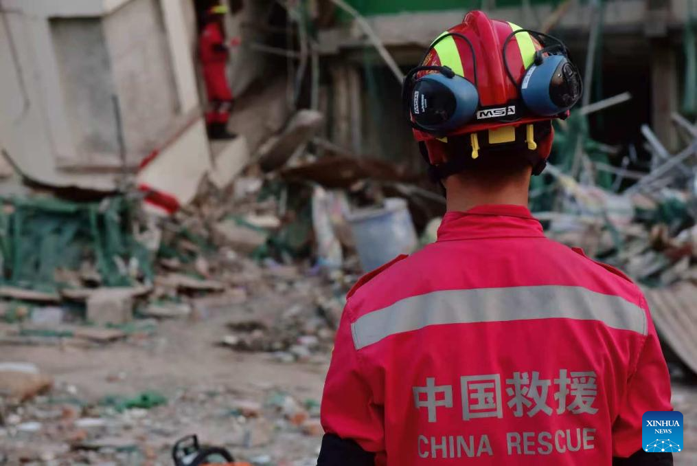 Members of the China international search and rescue team carry out search and rescue operation at a hotel in Mandalay, Myanmar, April 1, 2025. The China international search and rescue team has continued its rescue efforts in several areas of Mandalay, central Myanmar.