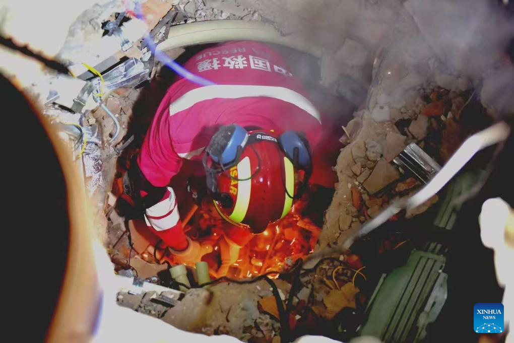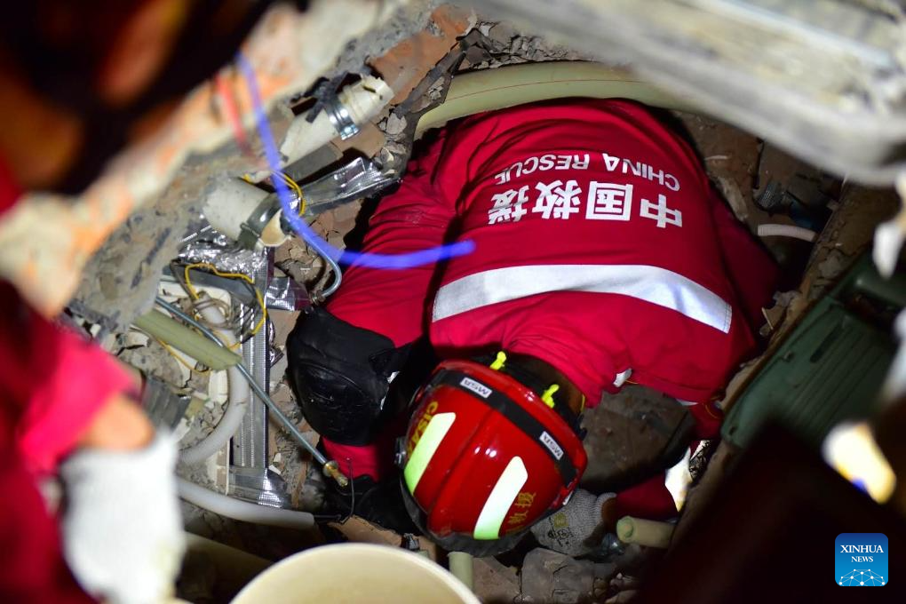 A member of the China international search and rescue team carries out search and rescue operation at a hotel in Mandalay, Myanmar, April 1, 2025. The China international search and rescue team has continued its rescue efforts in several areas of Mandalay, central Myanmar.