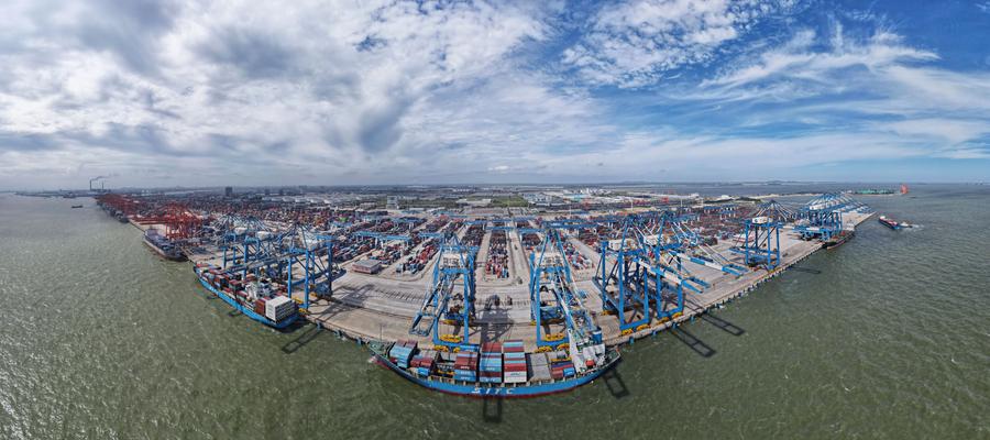 A drone panoramic photo taken on June 13, 2024 shows a cargo ship which passed the Kuandan Port of Malaysia unloading cargo at an automated container handling terminal of Qinzhou Port in Qinzhou, south China's Guangxi Zhuang Autonomous Region. (Xinhua/Jin Haoyuan)