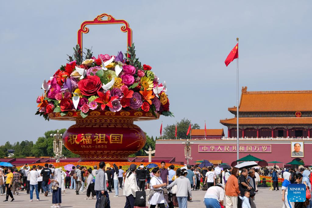 This photo taken on Sept. 25, 2025 shows a "flower basket" installation at Tian'anmen Square in Beijing, capital of China. The 18-meter-high installation in the shape of a flower basket is placed at Tian'anmen Square as a decoration for the upcoming National Day holiday. (Xinhua)