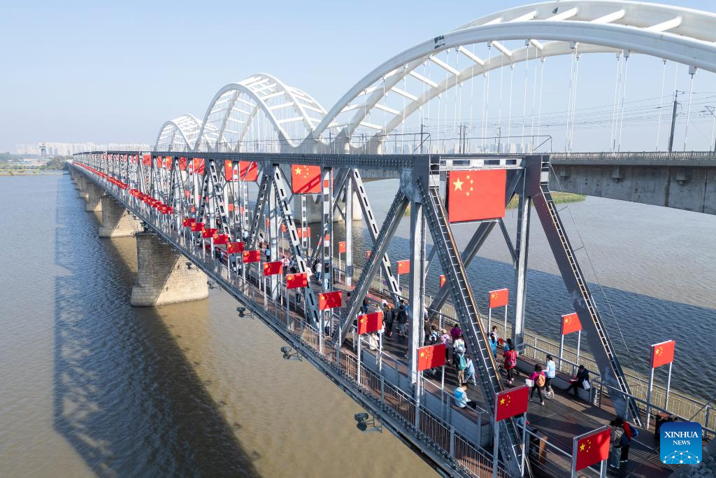People have fun in a pedestrian zone used to be a railway bridge in Harbin, northeast China's Heilongjiang Province, Oct. 1, 2025. The 76th anniversary of the founding of the People's Republic of China was observed on Wednesday in various ways across the country. (Xinhua/Zhang Tao)
