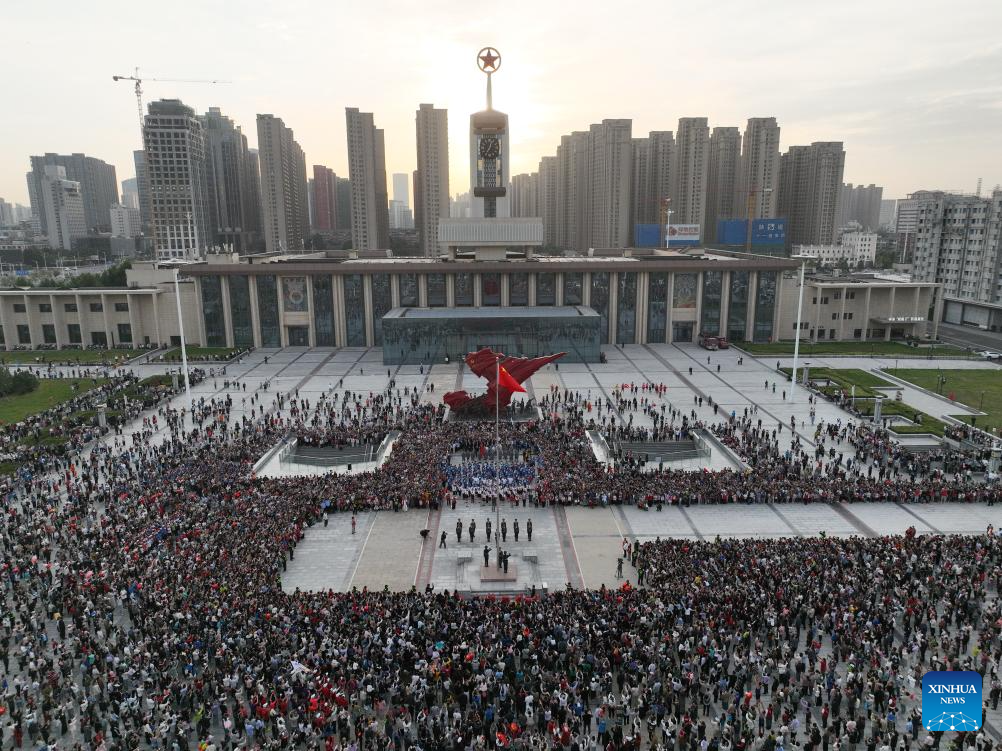 An aerial drone photo taken on Oct. 1, 2025 shows people attending a flag-raising ceremony in Shijiazhuang, north China's Hebei Province. The 76th anniversary of the founding of the People's Republic of China was observed on Wednesday in various ways across the country. (Photo by Liang Zidong/Xinhua)