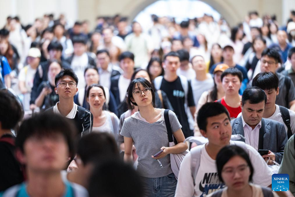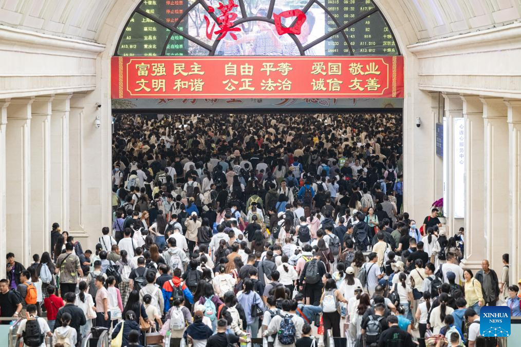 Passengers enter the Hankou Railway Station in Wuhan, central China's Hubei Province, on Oct. 1, 2025. The transportation network of the country witnessed a travel peak on the first day of the National Day holiday. (Xinhua/Xiao Yijiu)