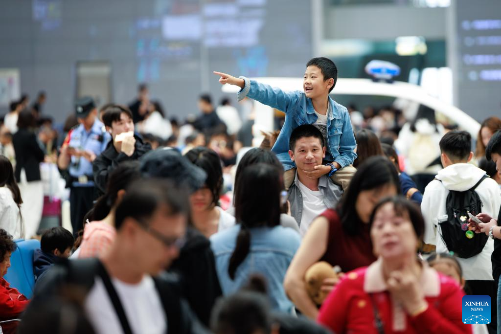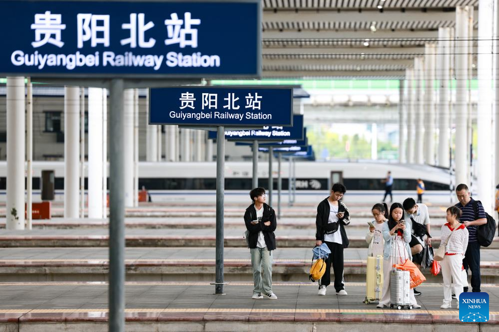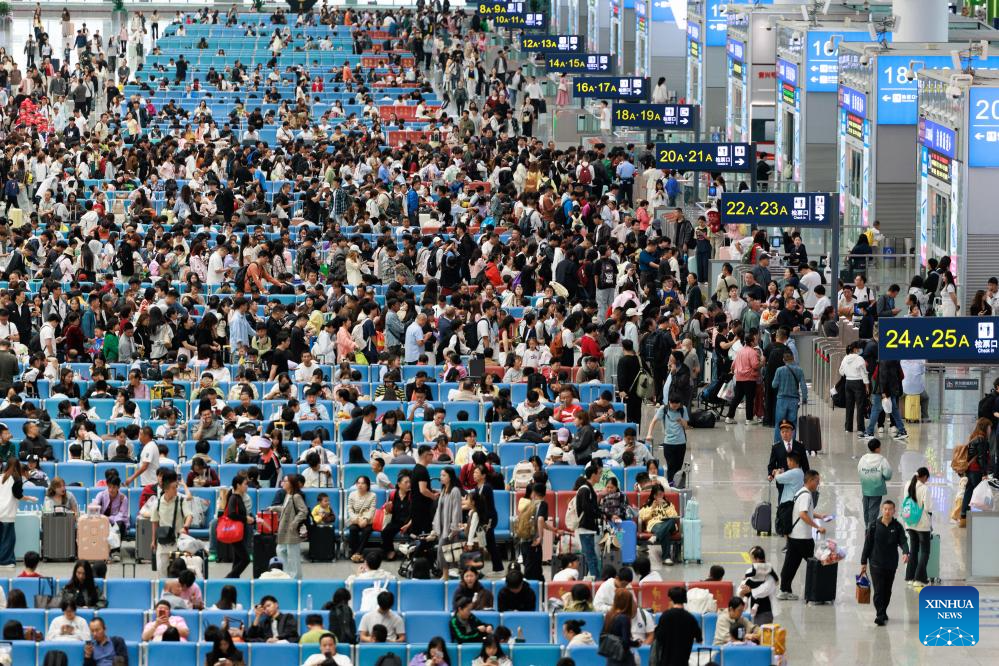 Passengers wait for trains at Guiyangbei Railway Station in Guiyang, southwest China's Guizhou Province, on Oct. 1, 2025. The transportation network of the country witnessed a travel peak on the first day of the National Day holiday. (Xinhua/Liu Xu)