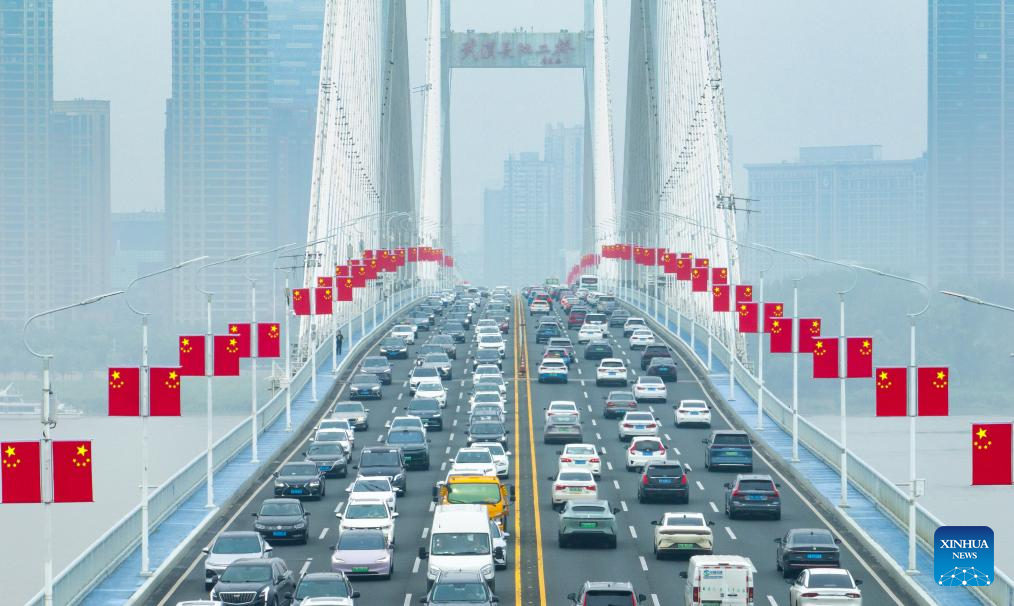 A drone photo taken on Oct. 1, 2025 shows vehicles passing across the Second Yangtze River Bridge in Wuhan, central China's Hubei Province. The transportation network of the country witnessed a travel peak on the first day of the National Day holiday. (Xinhua/Xiao Yijiu)