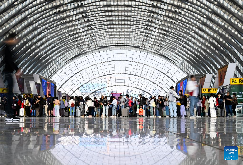 Passengers are pictured at a platform of the Nanjing Railway Station in Nanjing, east China's Jiangsu Province, Oct. 7, 2025. As the National Day and Mid-Autumn Festival holiday is drawing to a close, return travel flows increase across the country. (Photo by Su Yang/Xinhua)