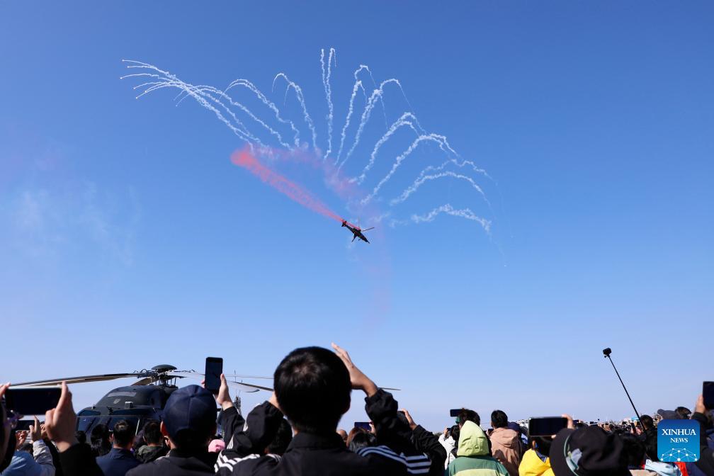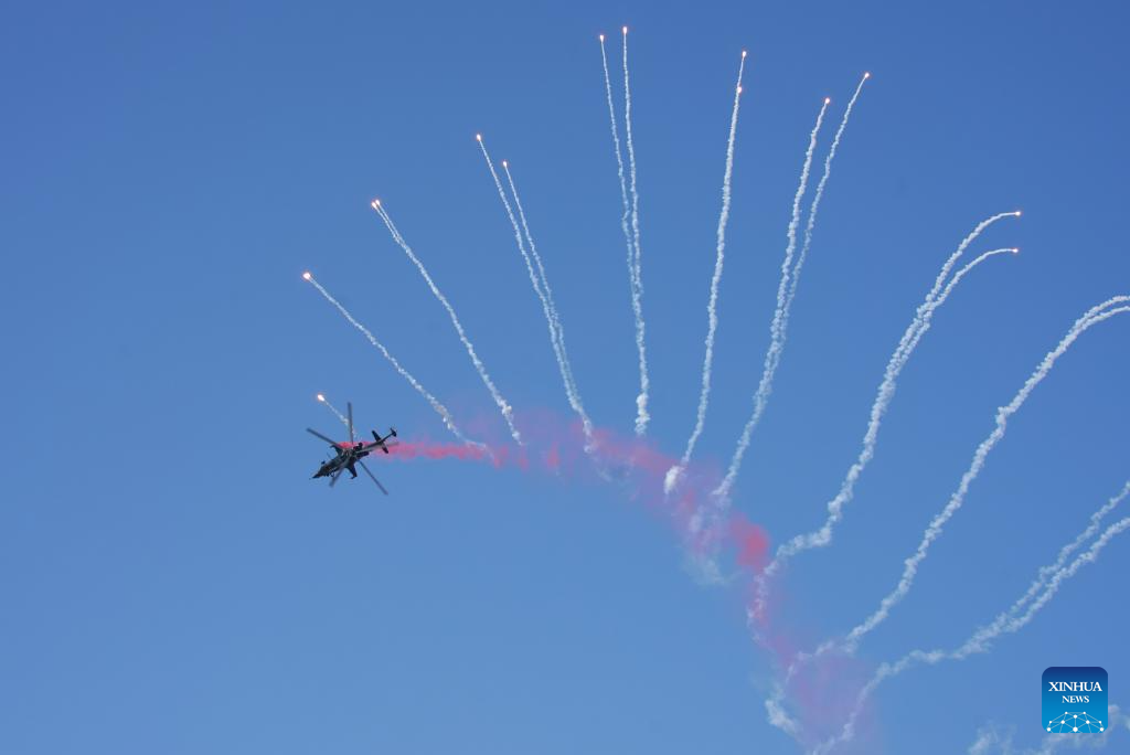 A helicopter of Fenglei aerobatic team of the Chinese People's Liberation Army (PLA) performs during the 7th China Helicopter Exposition in north China's Tianjin Municipality, Oct. 18, 2025. The exposition opens to the general public on Saturday. (Xinhua/Liu Fang)