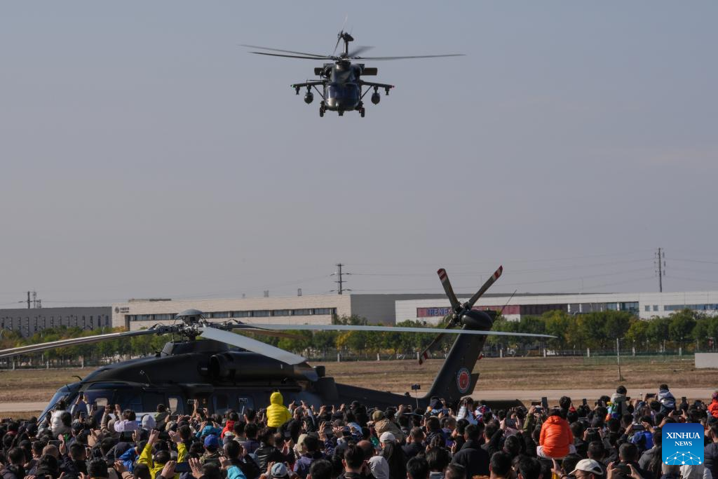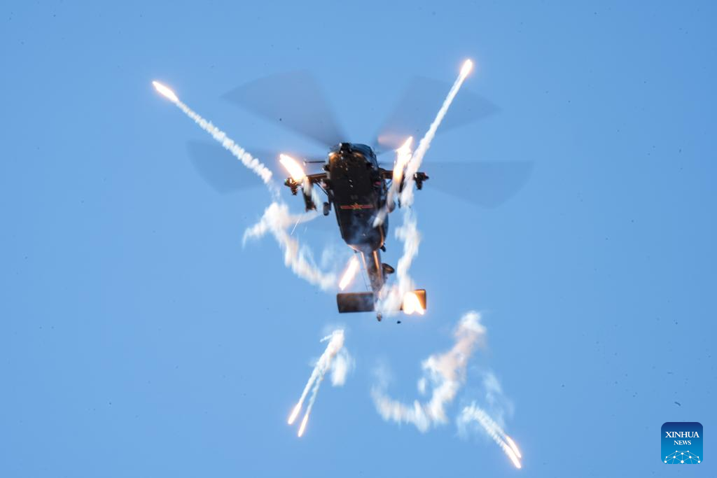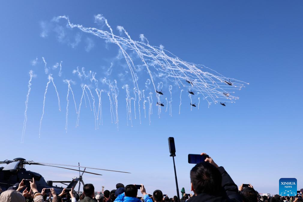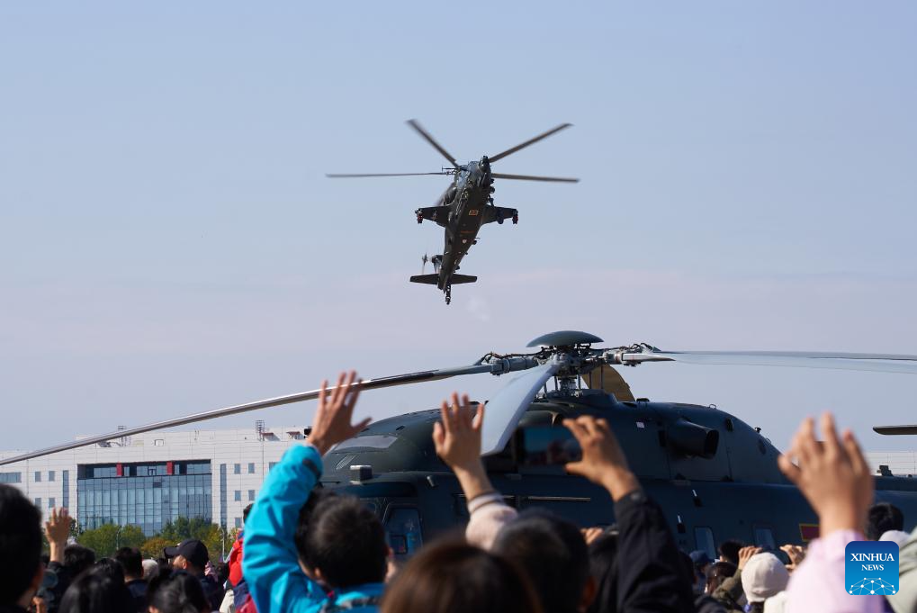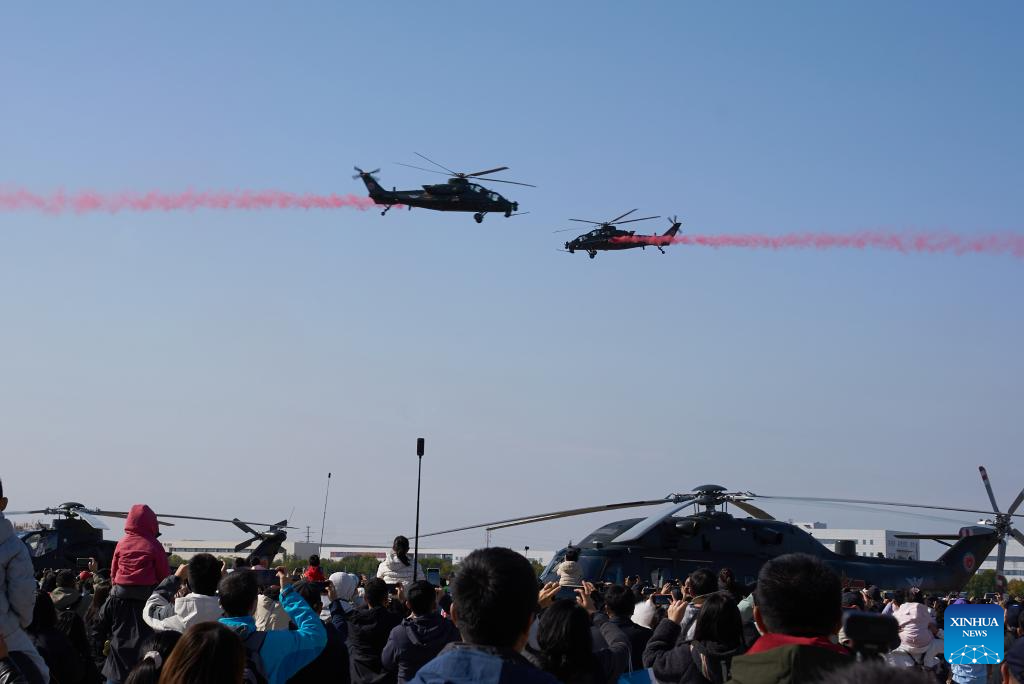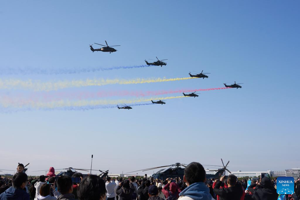 Helicopters of Fenglei aerobatic team of the Chinese People's Liberation Army (PLA) perform during the 7th China Helicopter Exposition in north China's Tianjin Municipality, Oct. 18, 2025. The exposition opens to the general public on Saturday. (Xinhua/Liu Fang)