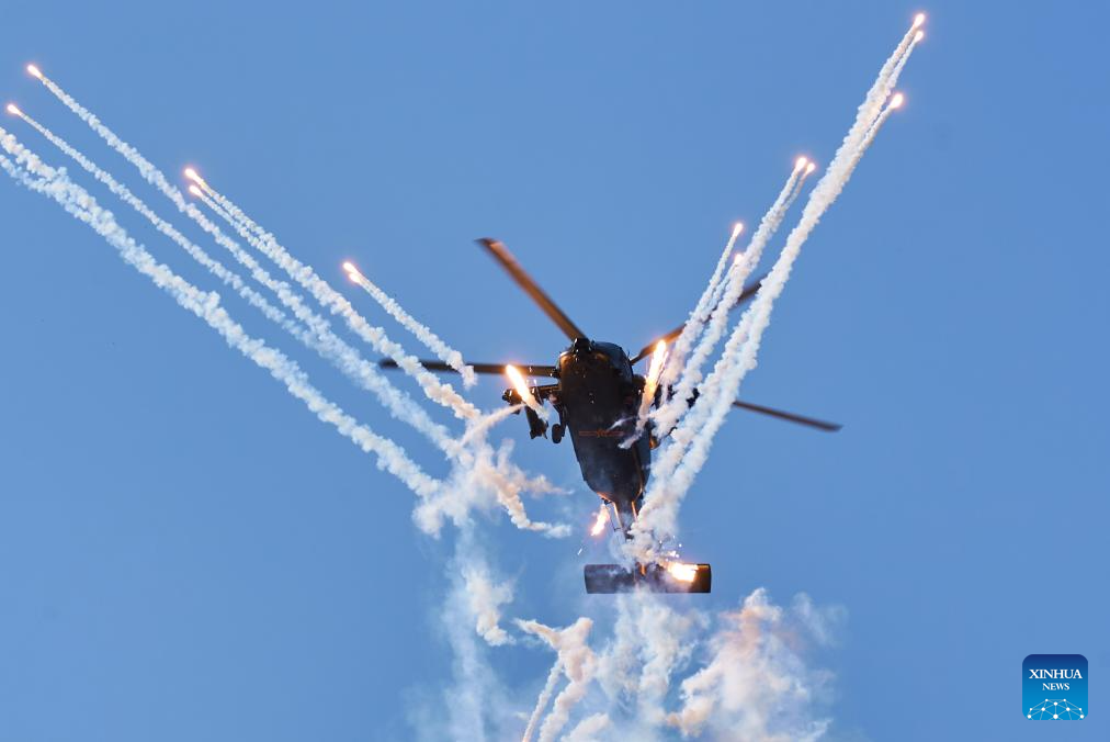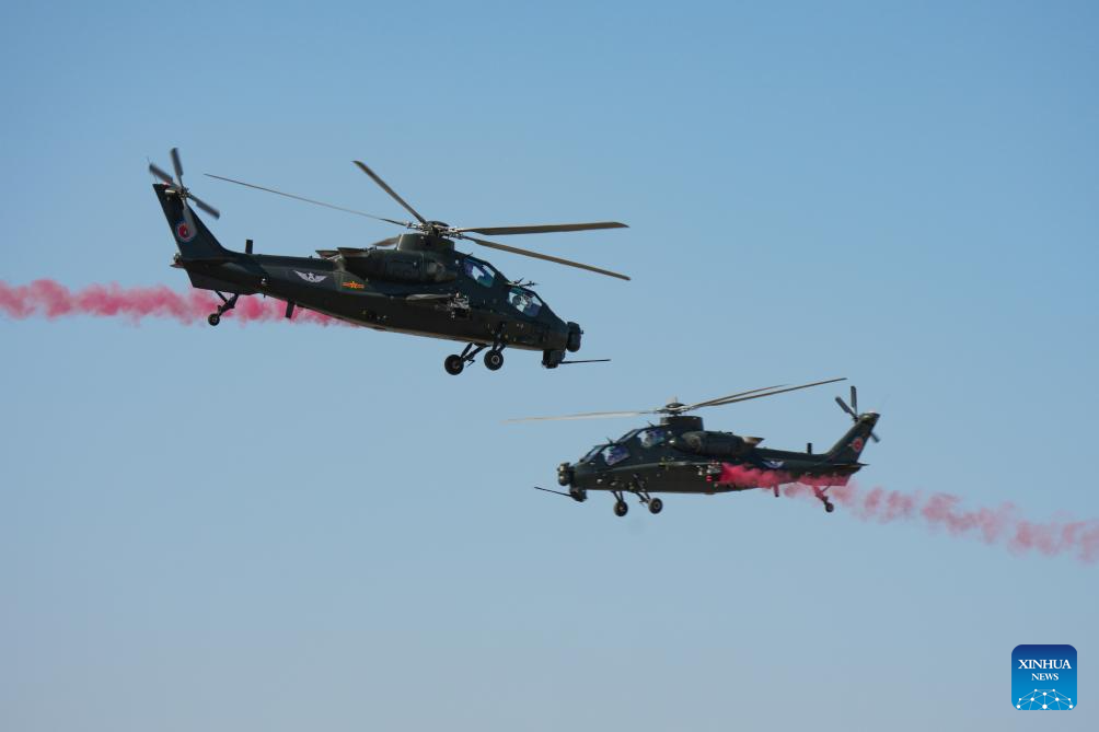 Helicopters of Fenglei aerobatic team of the Chinese People's Liberation Army (PLA) perform during the 7th China Helicopter Exposition in north China's Tianjin Municipality, Oct. 18, 2025. The exposition opens to the general public on Saturday. (Xinhua/Li Jie)