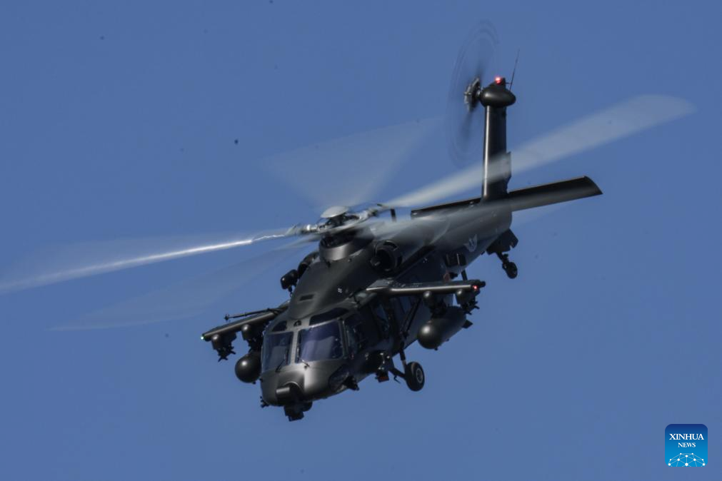 A helicopter of Fenglei aerobatic team of the Chinese People's Liberation Army (PLA) performs during the 7th China Helicopter Exposition in north China's Tianjin Municipality, Oct. 18, 2025. The exposition opens to the general public on Saturday. (Xinhua/Zhang Yongjin)
