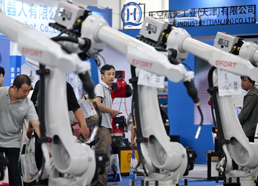People learn about robotic arms at the National Convention and Exhibition Center (Tianjin) in north China's Tianjin Municipality, Sept. 17, 2025. (Xinhua/Zhao Zishuo)