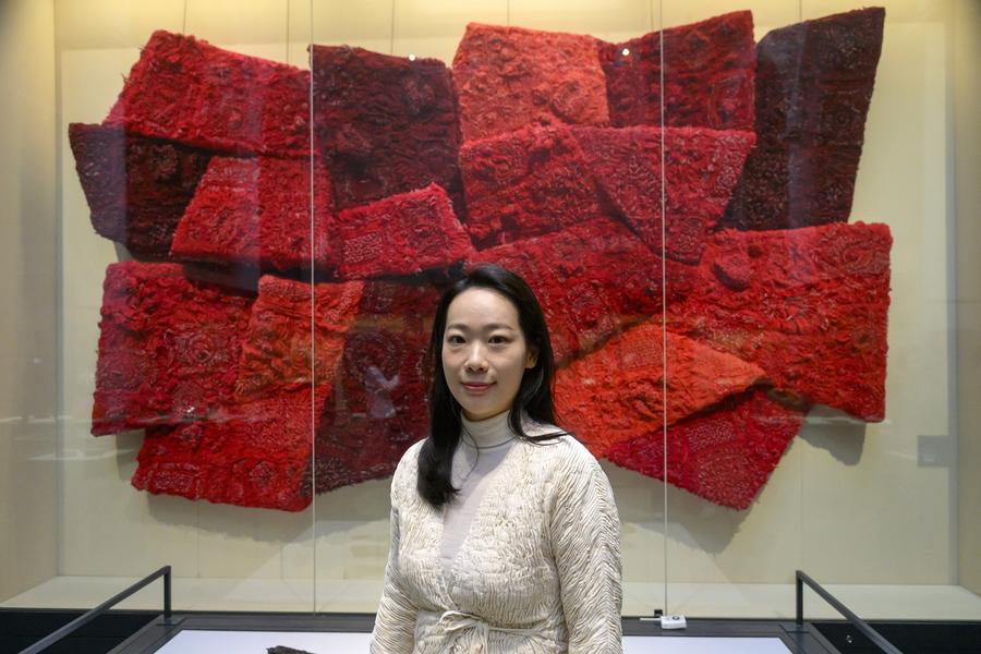 Lin Fanglu poses in front of her work during the media preview of the exhibition "Dimensions: Contemporary Chinese Studio Crafts," at the Victoria and Albert Museum (V&A) in London, Britain, Oct. 27, 2025. (Photo by Ray Tang/Xinhua)