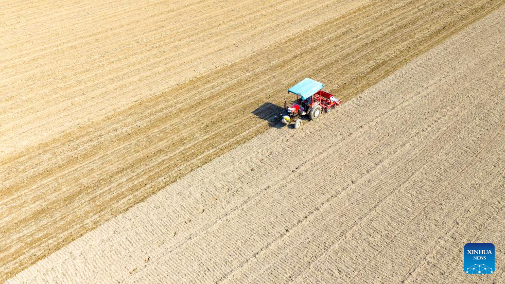 A farmer sows wheat in a field in Xinle City, north China's Hebei Province, Nov. 1, 2025. As of October 30, over 90% of the autumn grain have been harvested and over 25% of the winter wheat have been sowed across the country. (Photo by Jia Minjie/Xinhua)
