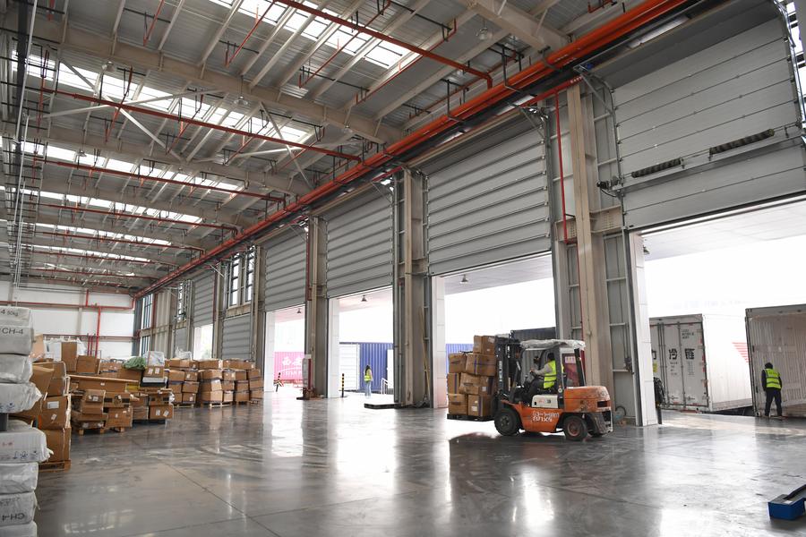 Workers operate at the Kazakhstan-Xi'an port of the Xi'an International Port Station in Xi'an, northwest China's Shaanxi Province, Nov. 14, 2025. (Xinhua/Shao Rui)