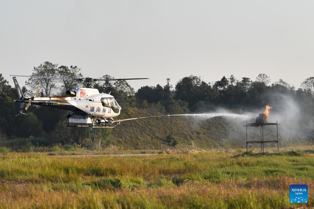 A helicopter conducts a fire drill during the 2025 Hunan International General Aviation and Low Altitude Economy Industry Expo at the Lusong Airport of Zhuzhou City, central China's Hunan Province, Nov. 21, 2025. The expo comprises a static exhibition at the Changsha International Convention and Exhibition Center in Changsha and an air show at the Lusong Airport of Zhuzhou City, both in central China's Hunan Province. (Xinhua/Chen Zhenhai)
