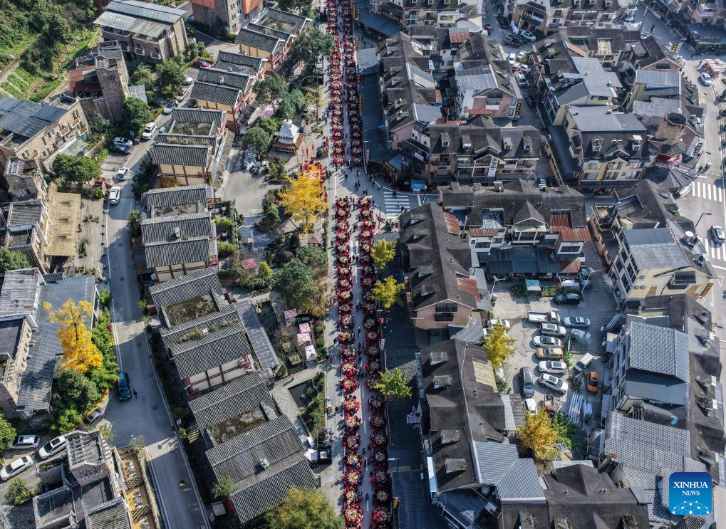 An aerial drone photo taken on Nov. 20, 2025 shows residents attending a group banquet in celebration of the Qiang New Year in Wenchuan County, Aba Tibetan and Qiang Autonomous Prefecture, southwest China's Sichuan Province. An event celebrating the Qiang New Year was held here from Wednesday to Thursday, featuring a series of activities. (Photo by Li Xiangyu/Xinhua)