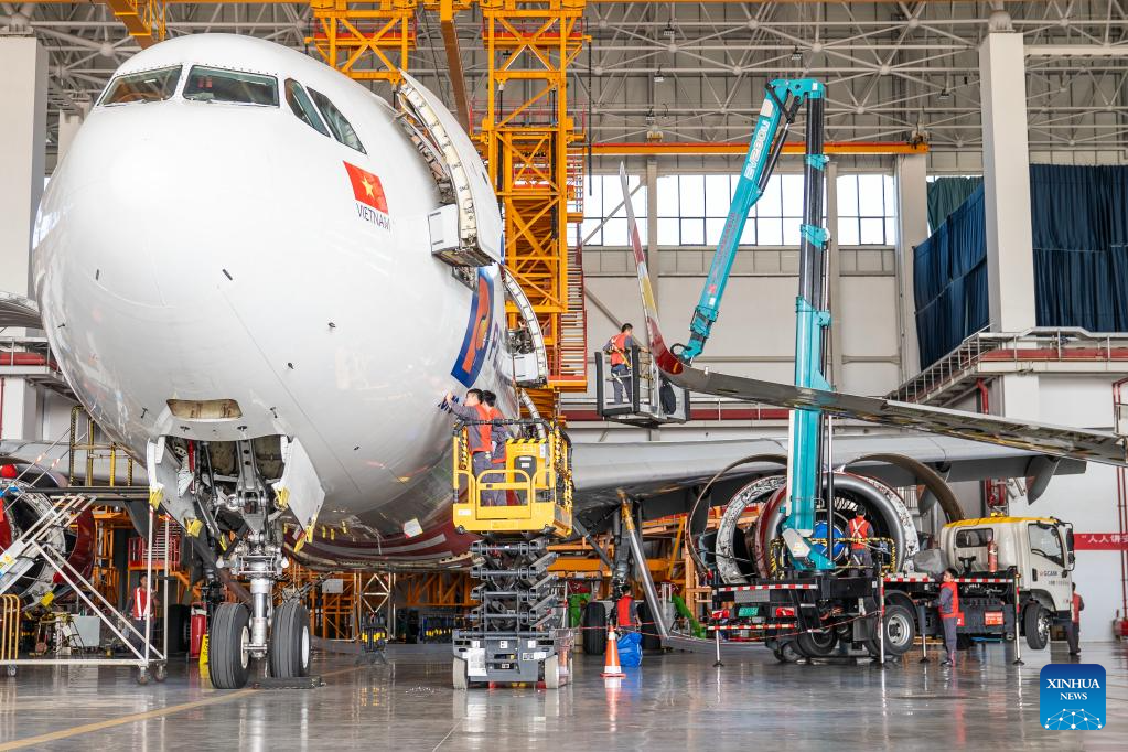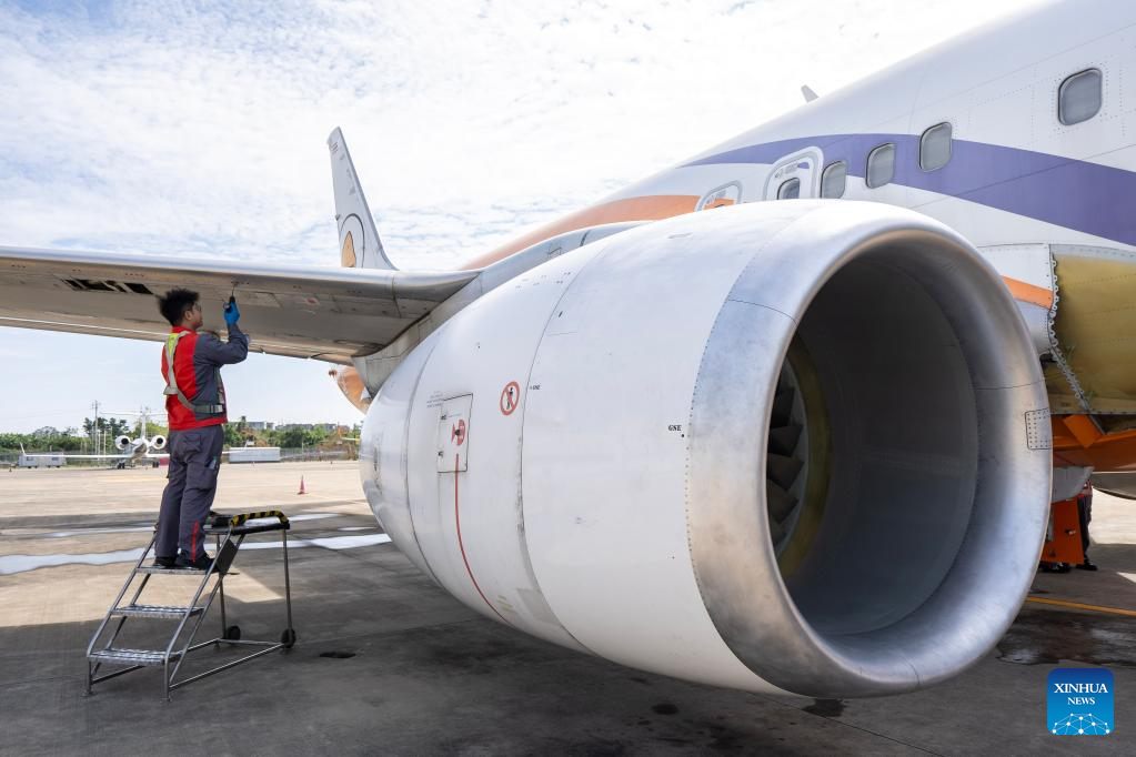 Staff members of the Grand China Aviation Maintenance Co., Ltd. under the HNA Technic perform maintenance on an aircraft at the Hainan Free Trade Port (FTP) One-Stop Aircraft Maintenance Base in Haikou, south China's Hainan Province, on Nov. 21, 2025. The Hainan Free Trade Port (FTP) One-Stop Aircraft Maintenance Base, which started operation in 2022, has performed maintenance service on more than 2,400 aircraft, completed full-body painting for over 280 aircraft, and repaired about 60,000 aircraft components as of the end of October this year.