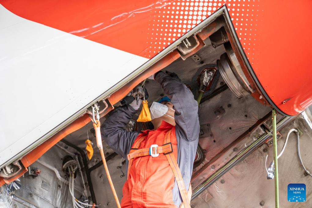 A staff member of the Grand China Aviation Maintenance Co., Ltd. under the HNA Technic performs maintenance on an aircraft at the Hainan Free Trade Port (FTP) One-Stop Aircraft Maintenance Base in Haikou, south China's Hainan Province, on Nov. 21, 2025. The Hainan Free Trade Port (FTP) One-Stop Aircraft Maintenance Base, which started operation in 2022, has performed maintenance service on more than 2,400 aircraft, completed full-body painting for over 280 aircraft, and repaired about 60,000 aircraft components as of the end of October this year.