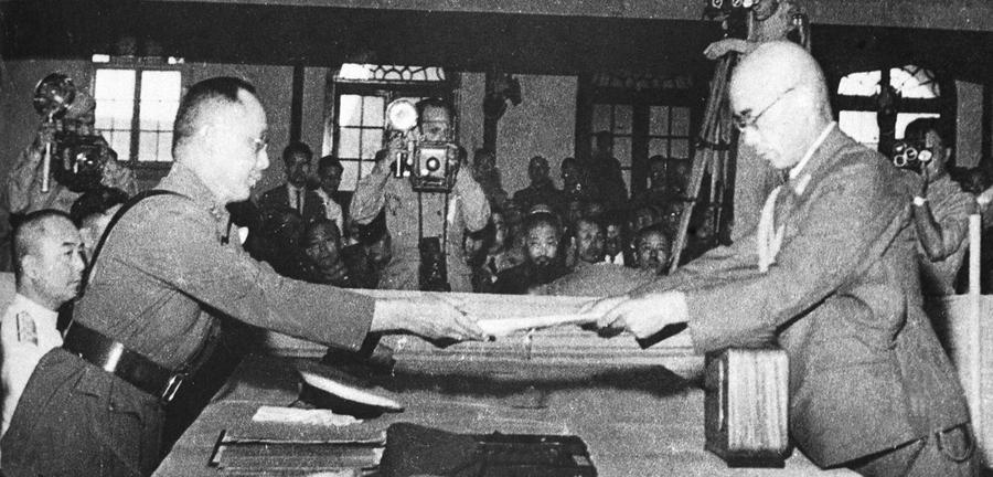 File photo taken on Sept. 9, 1945 shows He Yingqin (L), representative of the Chinese government, receiving the surrender of Japan in Nanjing, east China. (Xinhua)(zkr)