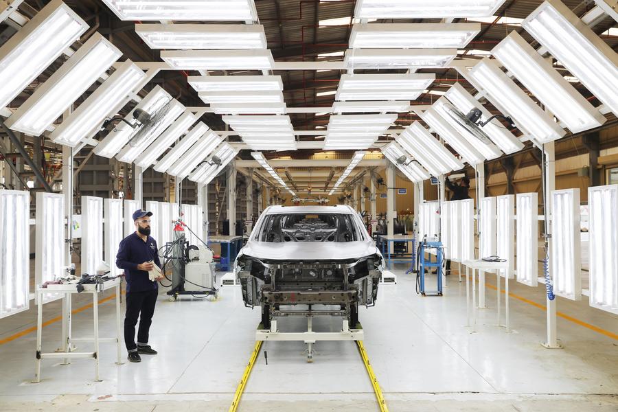 In Egypt's Giza province, local workers in blue uniforms are deftly operating orange robotic arms, welding and assembling vehicle parts in a 123 million-U.S. dollar joint venture between China's automotive brand Jetour and Egypt's major automotive dealer the Kasrawy Group.