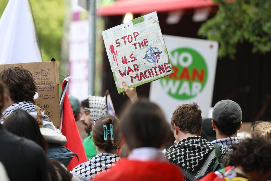 Protesters holding placards are pictured in The Hague, the Netherlands, June 22, 2025.The protest, attended by hundreds, took place two days before the NATO summit, where member states are expected to push for increased defense spending. (Xinhua/Zhao Dingzhe)