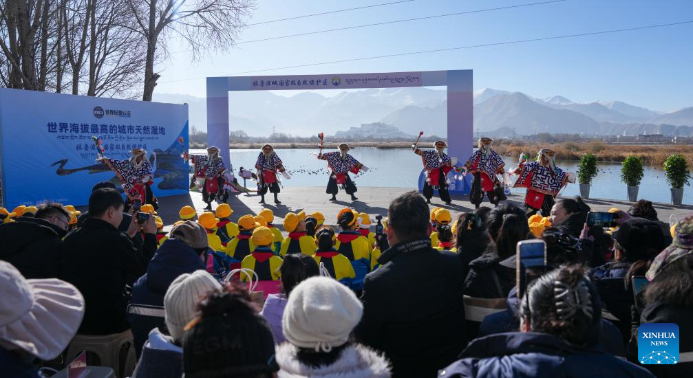 A performance is staged at a certification ceremony for the Lhalu Wetland National Nature Reserve in Lhasa, southwest China's Xizang Autonomous Region, Dec. 20, 2025. Verified by the World Record Certification Agency (WRCA), the Lhalu Wetland National Nature Reserve has been confirmed as the "highest altitude natural urban wetland." The certification ceremony was held at the wetland on Saturday.