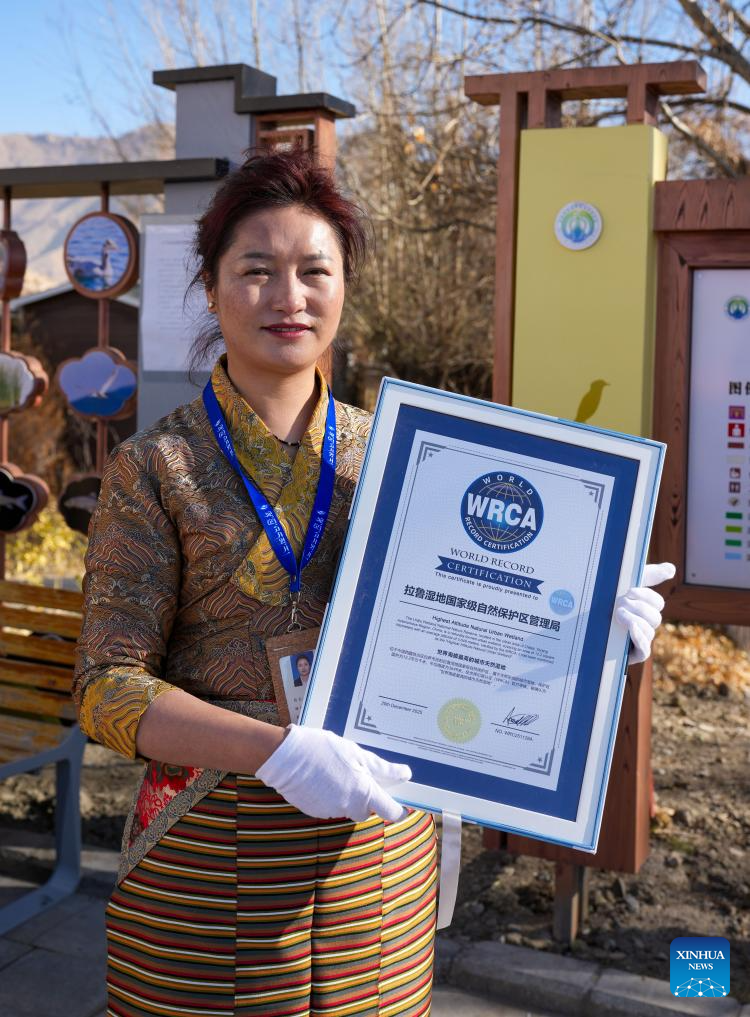 A staff member of the Lhalu Wetland National Nature Reserve displays a certificate issued by the World Record Certification Agency (WRCA), in Lhasa, southwest China's Xizang Autonomous Region, Dec. 20, 2025. Verified by the World Record Certification Agency (WRCA), the Lhalu Wetland National Nature Reserve has been confirmed as the "highest altitude natural urban wetland." The certification ceremony was held at the wetland on Saturday.