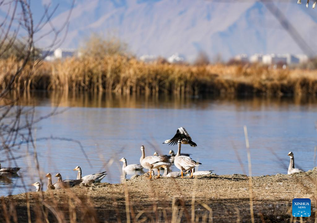 Bar-headed geese are pictured at the Lhalu Wetland National Nature Reserve in Lhasa, southwest China's Xizang Autonomous Region, Dec. 20, 2025. Verified by the World Record Certification Agency (WRCA), the Lhalu Wetland National Nature Reserve has been confirmed as the "highest altitude natural urban wetland." The certification ceremony was held at the wetland on Saturday.
