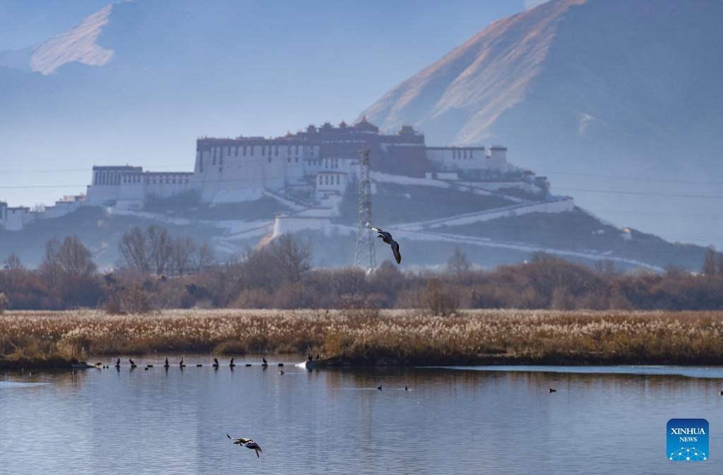 Bar-headed geese are pictured at the Lhalu Wetland National Nature Reserve, with the Potala Palace in the background, in Lhasa, southwest China's Xizang Autonomous Region, Dec. 20, 2025. Verified by the World Record Certification Agency (WRCA), the Lhalu Wetland National Nature Reserve has been confirmed as the "highest altitude natural urban wetland." The certification ceremony was held at the wetland on Saturday.