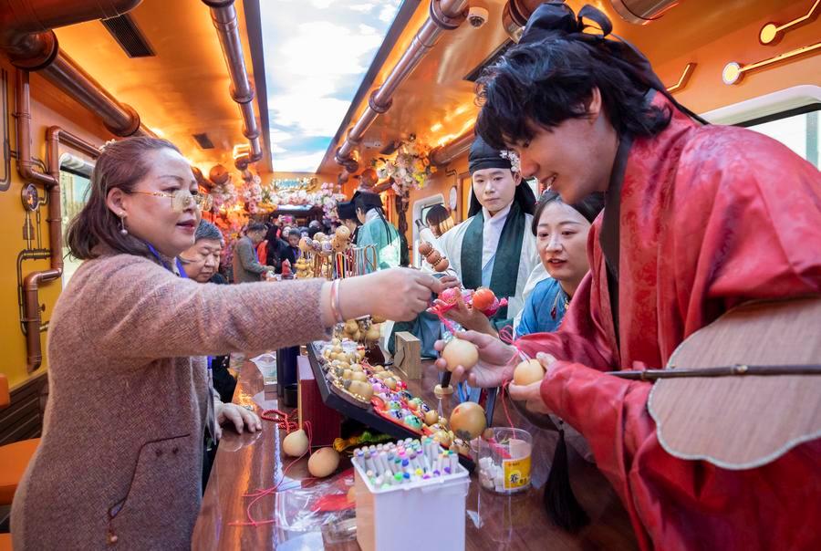 BEIJING, Jan. 1 (Xinhua) -- The Tianjin Fantasy Express has begun a scheduled round-trip service between Tianjin North Railway Station and Beijing Railway Station since Thursday. The line features 10 distinctively themed carriages integrating art performances, cultural presentations and intangible cultural heritage experience.