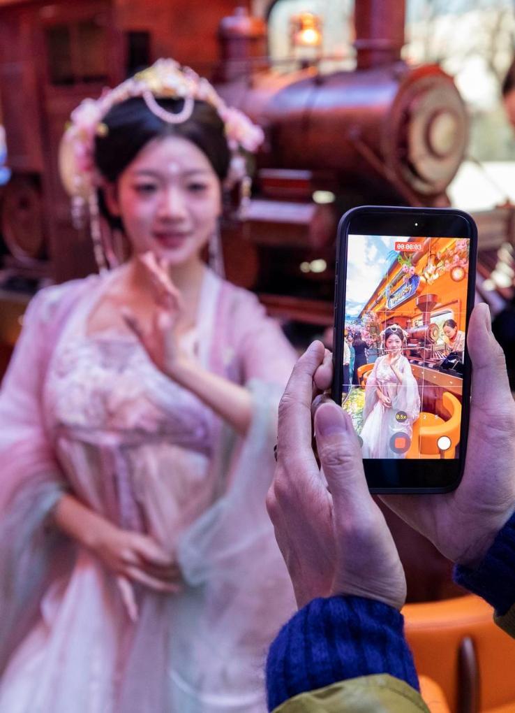 A tourist takes photos on a themed train running from Beijing Railway Station to Tianjin North Railway Station, Jan. 1, 2026. (Xinhua/Zhang Fan)