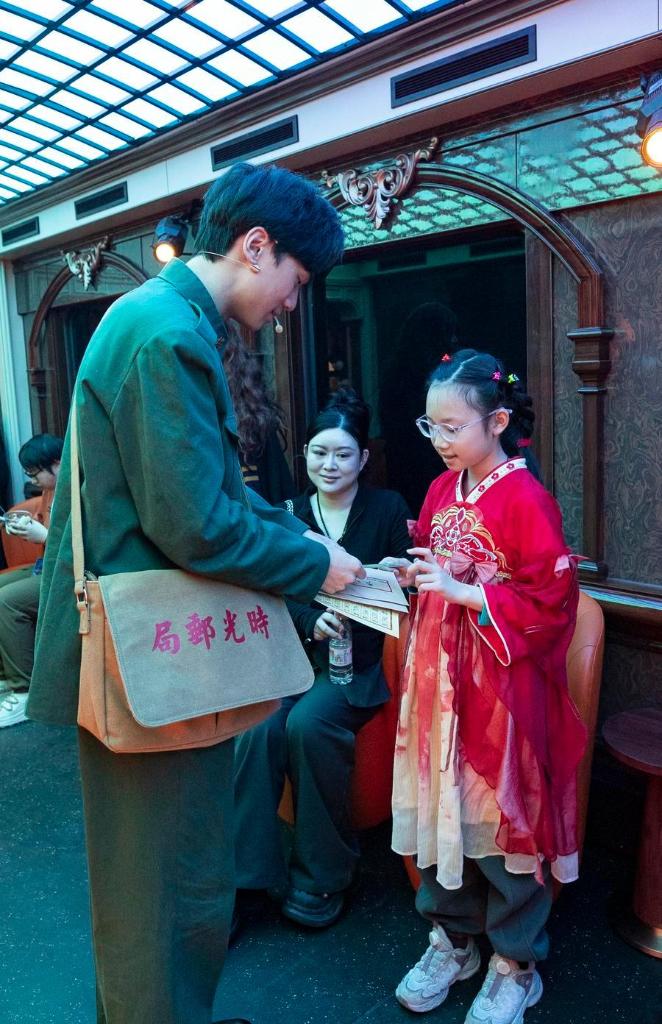 A tourist (R) interacts with a performer on a themed train running from Beijing Railway Station to Tianjin North Railway Station, Jan. 1, 2026. (Xinhua/Zhang Fan)