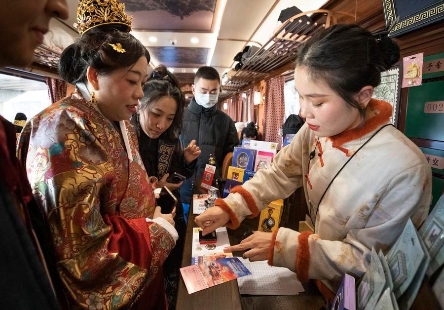 Tourists purchase commemorative envelopes and postcards on a themed train running from Tianjin North Railway Station to Beijing Railway Station, Jan. 1, 2026. (Xinhua/Zhang Fan)