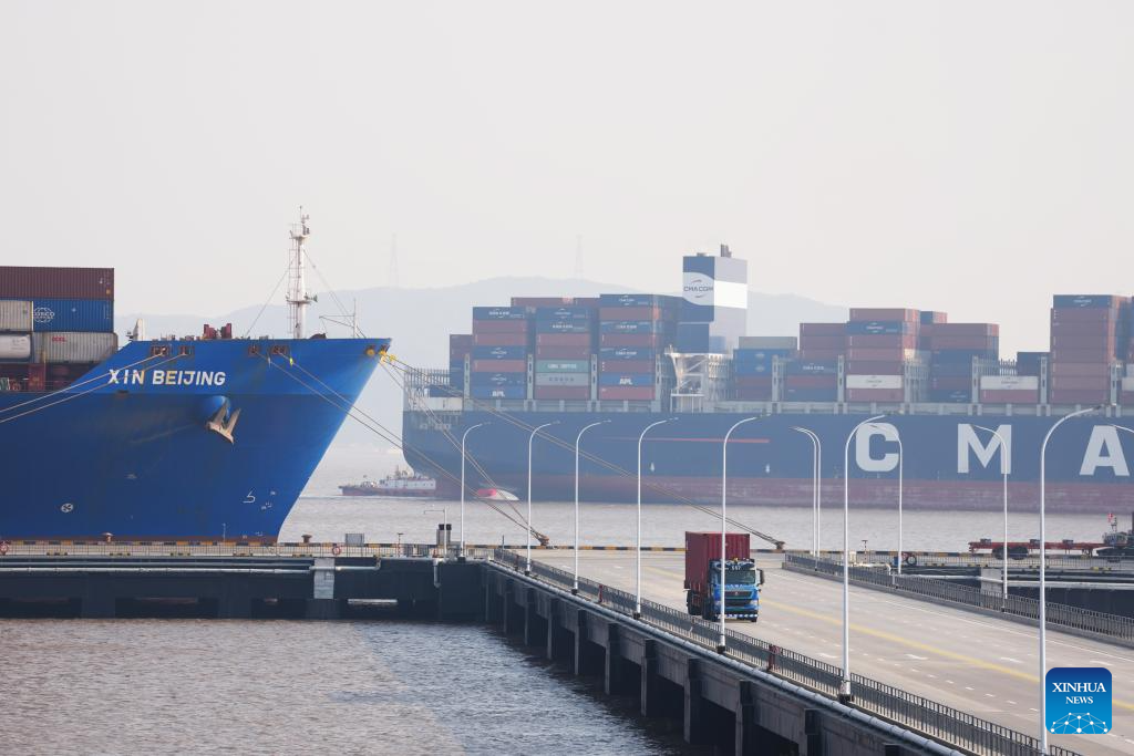 A cargo ship (L) berths at the Meishan area of Ningbo-Zhoushan Port, east China's Zhejiang Province, on Jan. 8, 2026. The Ningbo-Zhoushan Port saw its cargo throughput surpassing 1.4 billion tonnes in 2025, ranking the first globally for the 17th consecutive year, according to the port.
