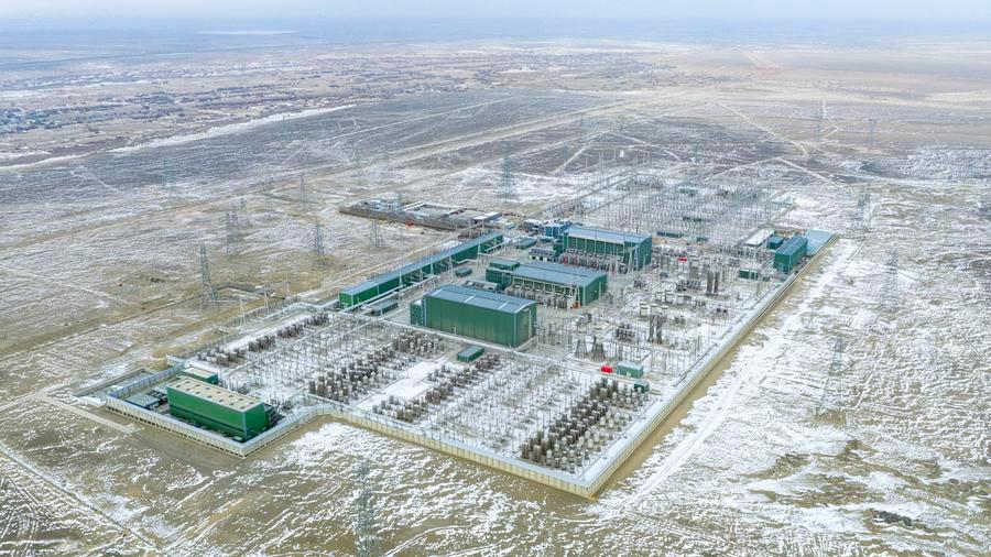 An aerial drone photo taken on Jan. 10, 2026 shows a current converter station for the Hami South-Zhengzhou ultra-high voltage direct current power line in Yizhou District of Hami, northwest China's Xinjiang Uygur Autonomous Region. (Photo by Zhang Lingjun/Xinhua)